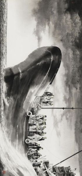 其二,該組畫選了四個關鍵歷史時刻,并以精湛的藝術駕馭力完成了視覺轉化,實現(xiàn)了宏大歷史主題的審美升華與詩意呈現(xiàn)。專家認為,四幅作品緊緊圍繞“傳薪”展開,敘事脈絡清晰,但藝術家針對四個不同的歷史情境,藝術處理手法各有不同 卻又各有巧思:《天下歸心》創(chuàng)新引入大篇幅宋體書法跋文并14位民主人士簽名活躍畫面,將歷史文獻的莊重感轉化為別具的視覺形式語言;《北上》匠心獨運,以“巨輪”為核心意象構建畫面,將人物的歷史抉擇置于波濤云海之間,用象征手法營造出恢宏的歷史動勢與空間史詩感;《共商國事》巧妙運用“以小見大”的敘事智慧,聚焦于“設計國徽”這一具體場景,折射出開國建制的宏大主題;《九二共識》則精心營造意境與象征表達,通過山水相連、血脈相通的自然元素構圖,喻示了海峽兩岸不可分割的中華民族共同體意識。