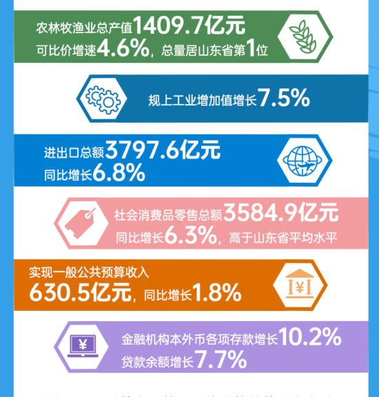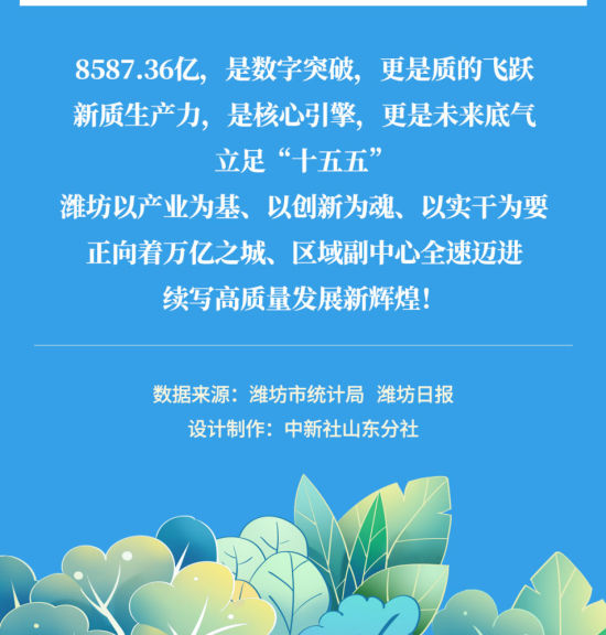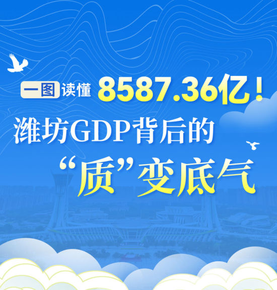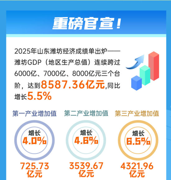 中新網(wǎng)山東新聞2月4日電(沈廣安)2月3日,2025年山東濰坊經(jīng)濟“成績單”出爐。濰坊GDP(地區(qū)生產(chǎn)總值)連續(xù)跨過6000億、7000億、8000億元三個臺階,達到8587.36億元,同比增長5.5%。其中,規(guī)模以上工業(yè)增加值同比增長7.5%;金融機構(gòu)本外幣各項存款、貸款余額分別增長10.2%和7.7%;居民人均可支配收入45794元,同比增長4.6%。下面,一圖讀懂濰坊8587.36億GDP背后的“質(zhì)”變底氣。
