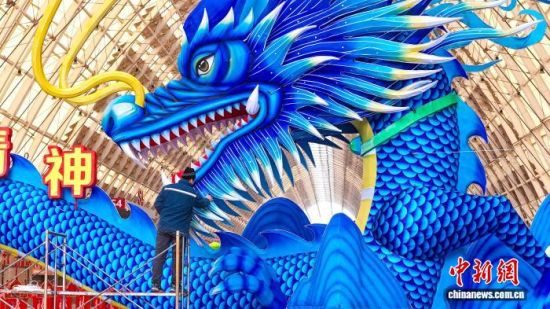2月3日,在山東省青島西海岸新區(qū)中鐵世界博覽城,來自“彩燈之鄉(xiāng)”四川自貢的匠人們正忙著制作和組裝大型燈組,迎接即將到來的馬年春節(jié)燈會。該燈會預(yù)計展出百余組大型燈組,旨在激活節(jié)日文旅消費,營造紅火興旺的春節(jié)消費市場。圖為工作人員在調(diào)整龍形燈組。(無人機(jī)照片)張進(jìn)剛 攝