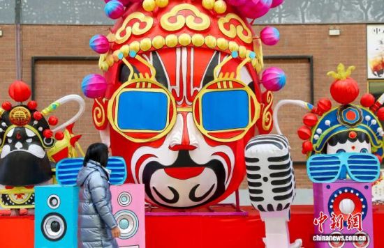 圖為民眾從“國潮臉譜”主題燈組前走過。張進(jìn)剛 攝