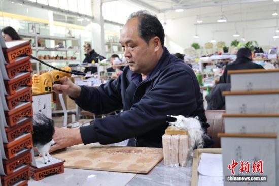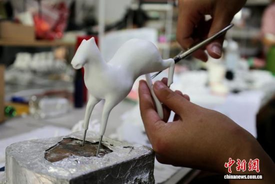 圖為工作人員在用軟陶捏制“馬彪彪”。趙曉 攝