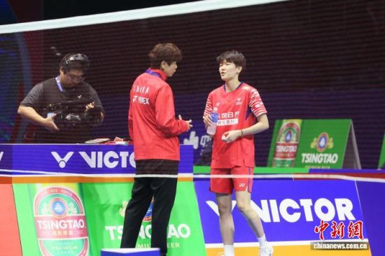 圖為中國羽毛球女隊賈一凡/張殊賢組合在賽后接受采訪。張孝鵬 攝