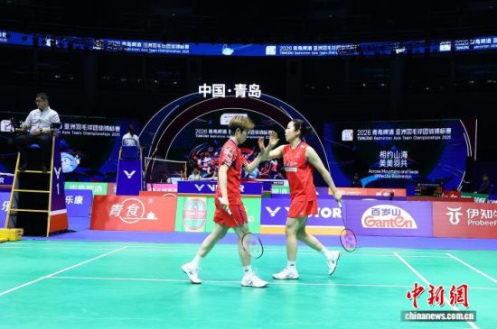 2月6日,中國羽毛球女隊(duì)以3:0戰(zhàn)勝印度隊(duì),晉級亞團(tuán)賽四強(qiáng)。圖為中國組合賈一凡/張殊賢在比賽中擊掌。(亞團(tuán)賽組委會(huì)供圖)