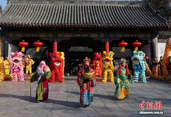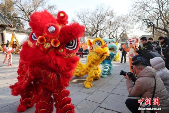 孔府門前的舞獅表演吸引觀眾觀看。趙曉 攝