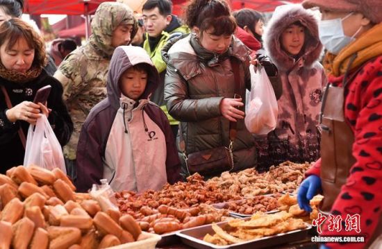 2月10日,山東煙臺,福山大集上的炸貨吸引民眾選購。中新社記者 王嬌妮 攝