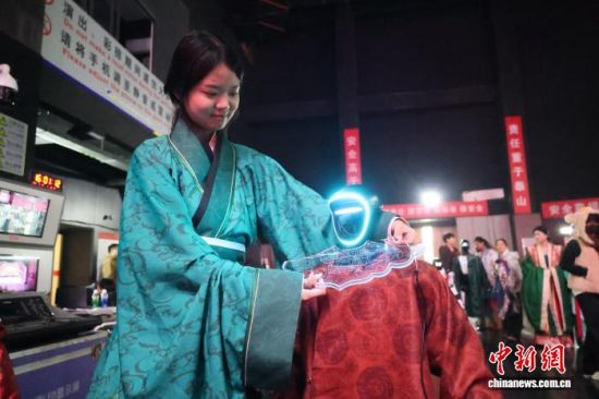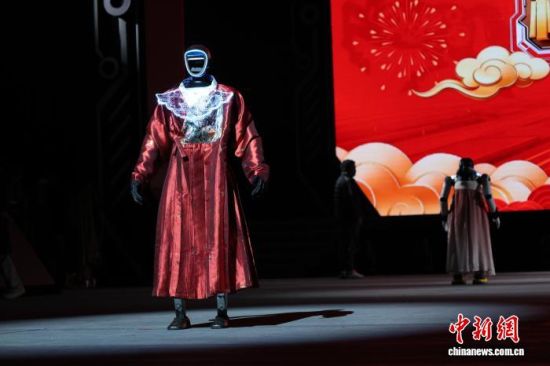 2月10日晚,山東濟寧大劇院,2026山東省機器人春節(jié)晚會彩排現(xiàn)場,大學生為漢服走秀機器人穿漢服!赌奚讶A章》節(jié)目以“人機共秀”的形式,讓漢服文化煥新出彩。周藝偉 攝