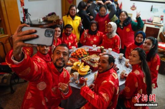 2022年1月25日,外籍學生、客商等歡聚一堂,身著“中國紅”服飾,共度中國小年并體驗當地民俗。中新社記者 董易鑫 攝