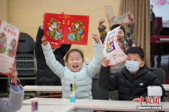 2021年2月4日,中國傳統(tǒng)節(jié)日——小年。圖為制作完年畫的小學生興奮不已,等待老師發(fā)灶糖。中新社記者 闞力 攝