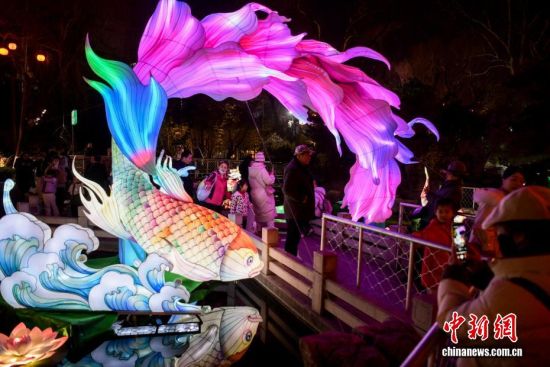 2月12日,山東濟(jì)南第45屆天下第一泉迎春花燈會試亮燈。景區(qū)內(nèi)燈火璀璨,年味滿盈,吸引了不少市民和游客前來賞燈。圖為游客觀賞花燈。