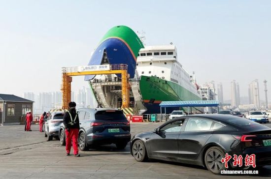 2月13日,煙臺(tái)港客運(yùn)碼頭,新能源汽車排隊(duì)駛?cè)搿熬G安達(dá)”輪。中新社記者 王嬌妮 攝