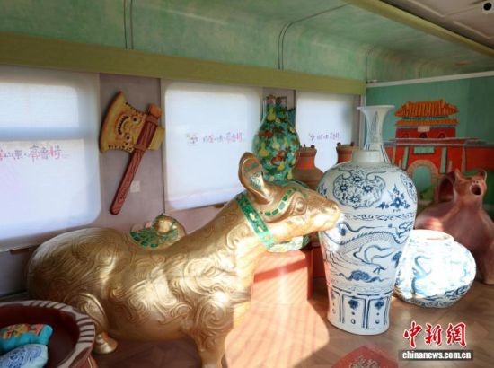 圖為列車(chē)綜合娛樂(lè)車(chē)廂內(nèi)的“文物森林”。李欣 攝