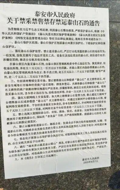 在泰山腳下買的工藝品石頭,為何也成了“禁寄品”?這并非快遞小哥“不愿寄”,而是嚴格執(zhí)行當?shù)氐姆煞ㄒ?guī)。媒體查詢發(fā)現(xiàn),2025年9月7日,泰安市人民政府曾發(fā)布一則《關于禁采禁售禁存禁運泰山石的通告》。
