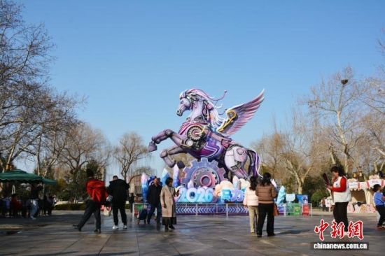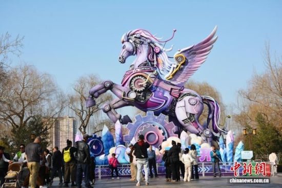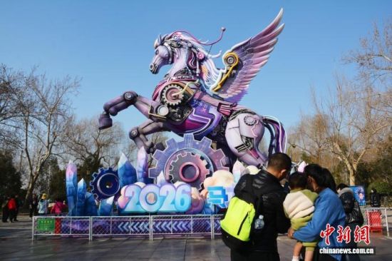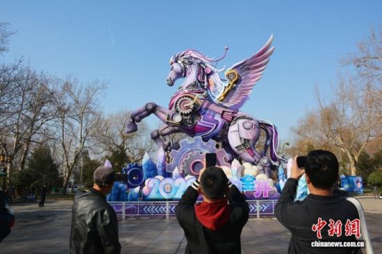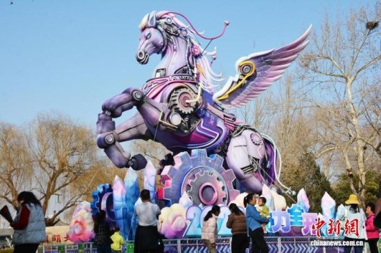 2月14日,山東濟南大明湖景區(qū),生肖馬主題大型花燈吸引了眾多游客駐足觀賞、拍照打卡。中新社記者 呂妍 攝