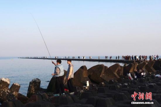 2月20日,游人在防浪石上海釣。 孫琳茹 攝