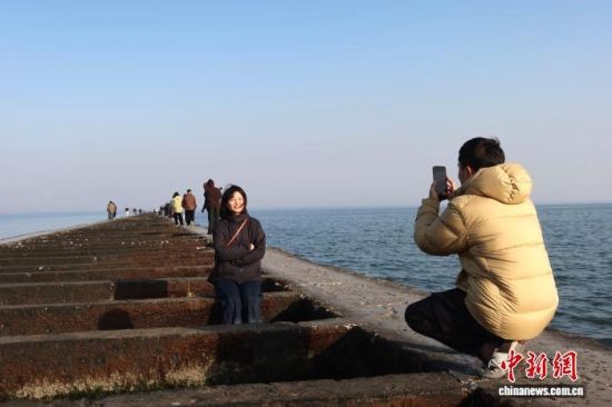 2月20日,游人在孤東海堤上拍照打卡。 孫琳茹 攝