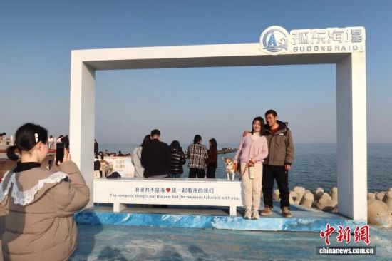 2月20日,游人在孤東海堤合影留念。 孫琳茹 攝