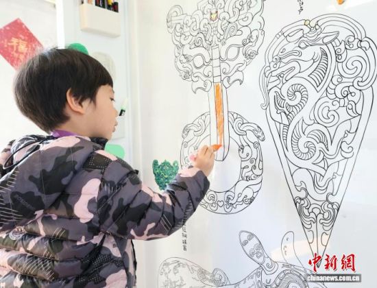 小朋友在列車上把剪紙穿戴在身。趙曉 攝