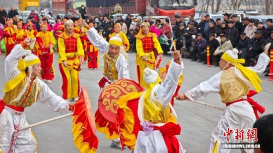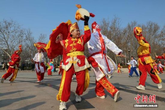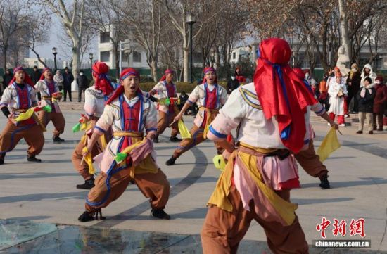 1月23日,濟南商河鼓子秧歌廣場,社區(qū)藝術團隊員身著傳統(tǒng)服飾,伴著鼓點,表演鼓子秧歌。中新社記者 趙曉 攝