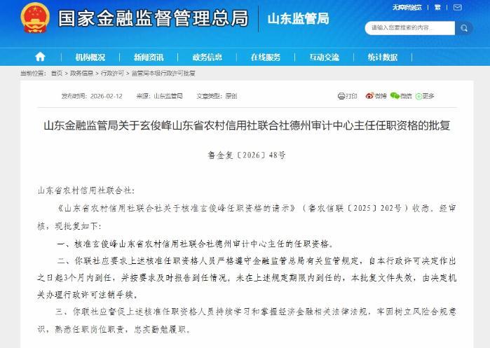 近日,國(guó)家金融監(jiān)督管理總局山東監(jiān)管局發(fā)布批復(fù)公告,核準(zhǔn)了玄俊峰山東省農(nóng)村信用社聯(lián)合社(下稱“山東省聯(lián)社”)德州審計(jì)中心主任的任職資格。