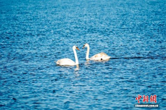 2月18日,在東營黃河口生態(tài)旅游區(qū),兩只疣鼻天鵝在濕地水域中相伴游弋。任明杰 攝