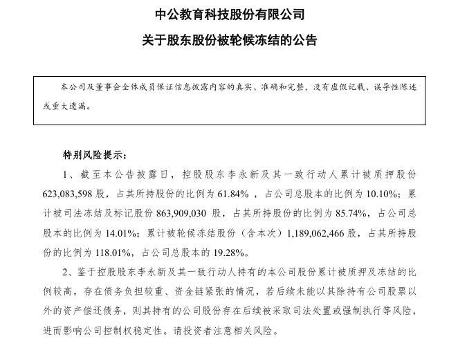 近日,中公教育科技股份有限公司(簡稱“中公教育”)發(fā)布公告稱,公司控股股東、創(chuàng)始人李永新所持8.39億股股份被輪候凍結(jié),占其個人持股比例的100%,占公司總股本的13.60%。凍結(jié)起始日為2026年2月12日,輪候期限36個月。