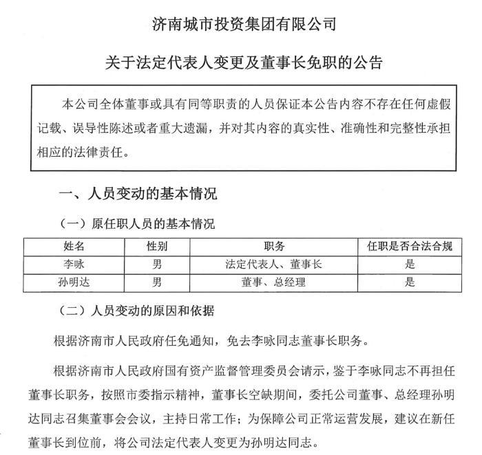 2月27日,濟南城市投資集團有限公司(下稱“濟南城投”)發(fā)布關于法定代表人變更及董事長免職的公告稱,根據(jù)濟南市人民政府任免通知,免去李詠董事長職務;因董事長空缺,委托公司董事、總經(jīng)理孫明達主持日常工作,同時變更公司法定代表人為孫明達。