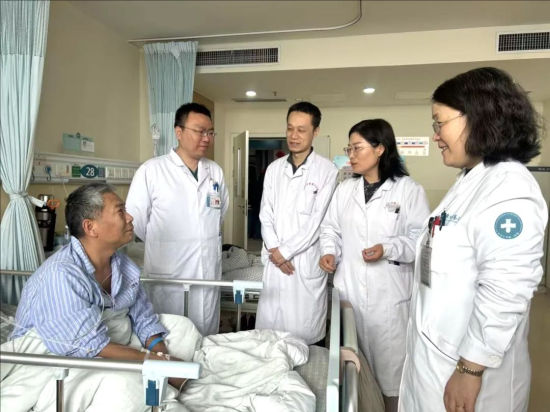 ▲罕見(jiàn)病患者老周即將出院,圖為四名不同科室的醫(yī)生聯(lián)合進(jìn)行查房