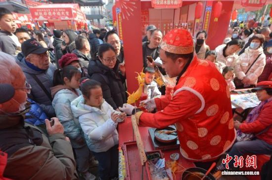 圖為小朋友現(xiàn)場體驗(yàn)吹糖人。王海濱 攝