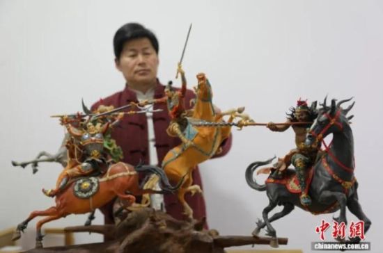 潁淮面塑藝人高光彪創(chuàng)作的《三英戰(zhàn)呂布》面塑作品。中新網(wǎng)記者 韓輝 攝