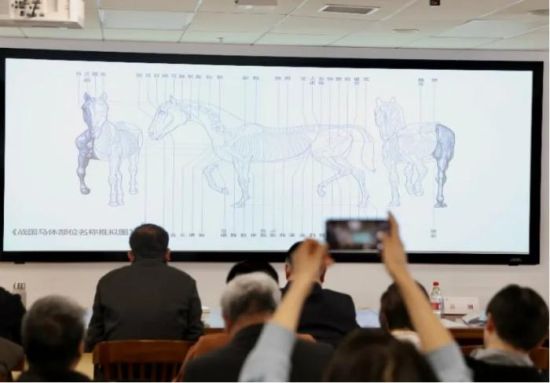 在《清華大學(xué)藏戰(zhàn)國竹簡(拾伍)》暨校釋、英譯系列成果發(fā)布會(huì)上展出的戰(zhàn)國馬體部位名稱推擬圖。 中新社記者 易海菲 攝