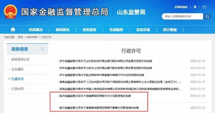 3月10日,國家金融監(jiān)督管理總局山東監(jiān)管局發(fā)布公告稱,臨沂金融監(jiān)管分局已核準(zhǔn)諸葛善偉山東蒙陰農(nóng)村商業(yè)銀行股份有限公司(下稱“蒙陰農(nóng)商銀行”)董事長的任職資格,核準(zhǔn)徐鍇蒙陰農(nóng)商銀行行長的任職資格,批復(fù)時(shí)間均為2026年3月4日。