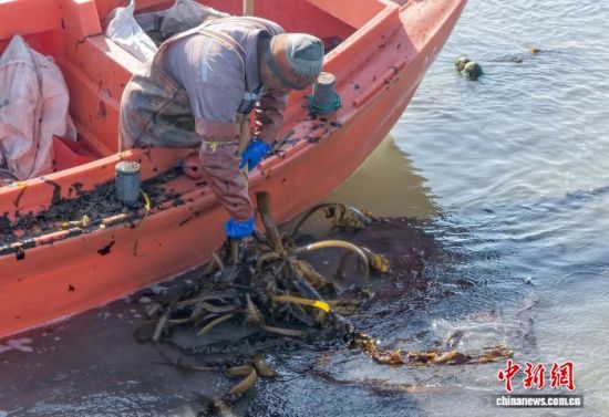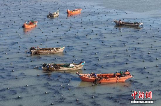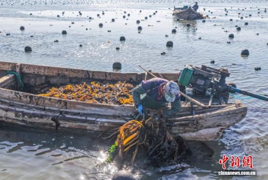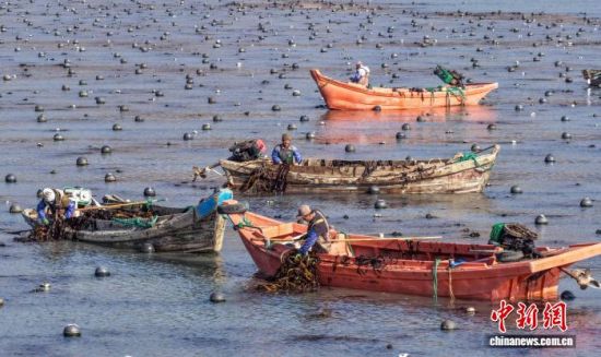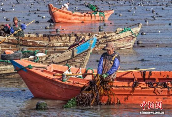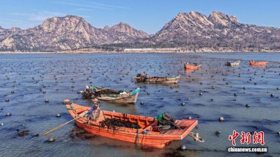 3月19日,在山東省榮成市石島管理區(qū)南部海域,漁民們忙著采收裙帶菜。時(shí)下正值春季海產(chǎn)養(yǎng)殖關(guān)鍵時(shí)期,漁民們分工協(xié)作,奔赴養(yǎng)殖海域有序作業(yè)。榮成是中國重要的海珍品養(yǎng)殖基地,當(dāng)?shù)亟陙戆l(fā)展裙帶菜等特色養(yǎng)殖業(yè),帶動(dòng)漁民增收致富。(無人機(jī)照片)李信君 攝