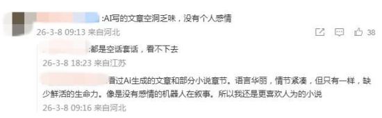 有報道稱,社交媒體上的AI寫作暴富噱頭,讓網文圈變了天。有網文作家坦言,自己日更近萬字已是極限,但在AI幾分鐘幾萬字面前,直接被降維打擊。評論區(qū)里,網友議論紛紛,“AI寫的文章空洞乏味,沒有個人感情”“有一本AI文火的嗎”……