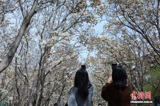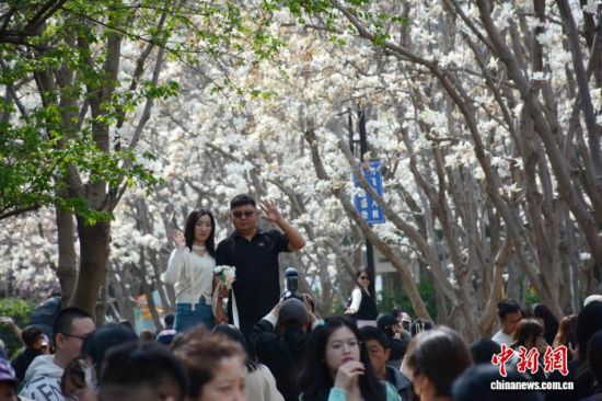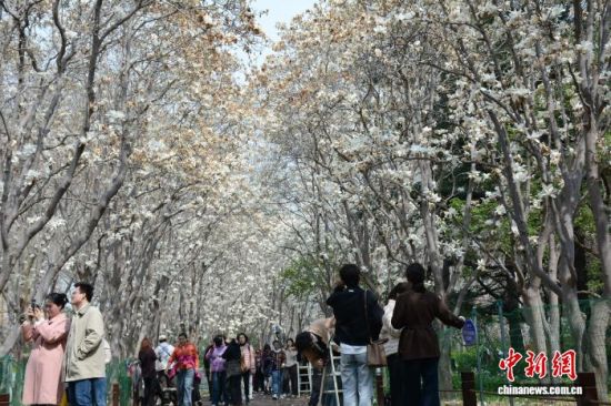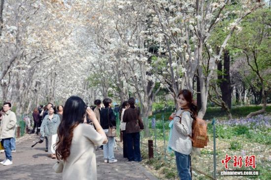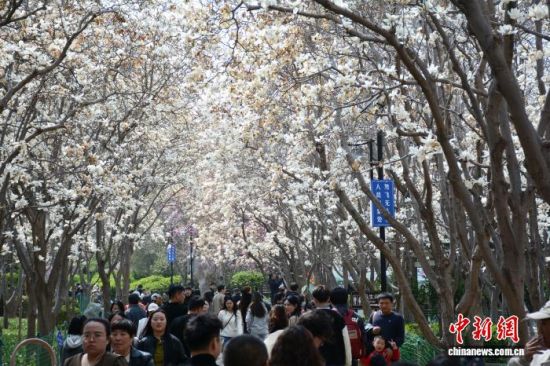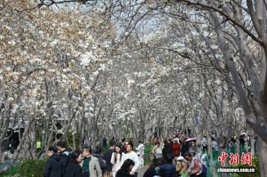 3月24日,濟南百花公園玉蘭大道玉蘭花盛放,潔白花瓣綴滿枝頭,形成綿延的空中花廊。市民游客漫步其間,駐足拍照、聞香賞春。中新社記者 呂妍 攝