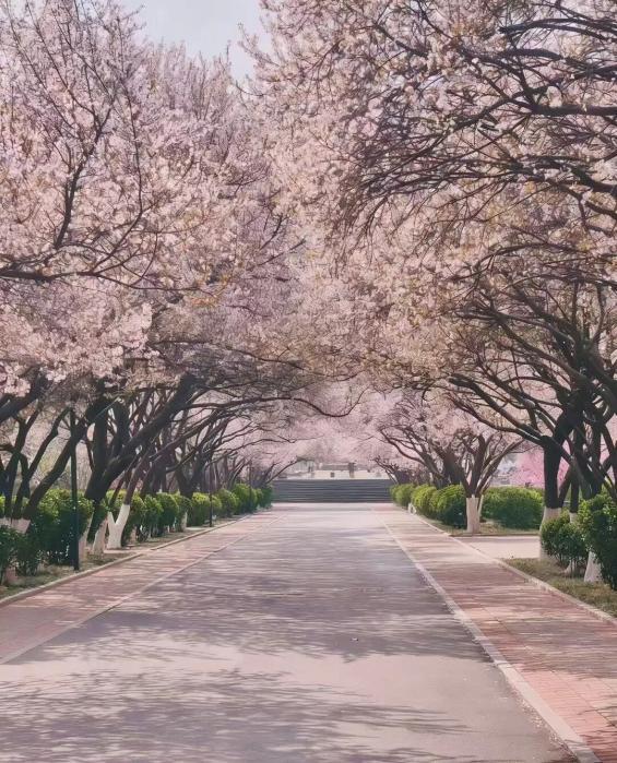 兩側(cè)花枝交錯相擁,粉白花瓣覆滿枝頭,與紅磚樓宇相映,書香氤氳更顯清雅。春風拂過,落英紛飛,漫步其間,書聲伴花香,既有校園青春的鮮活,又有歲月沉淀的溫柔,是學子與游人心中獨有的春日記憶。