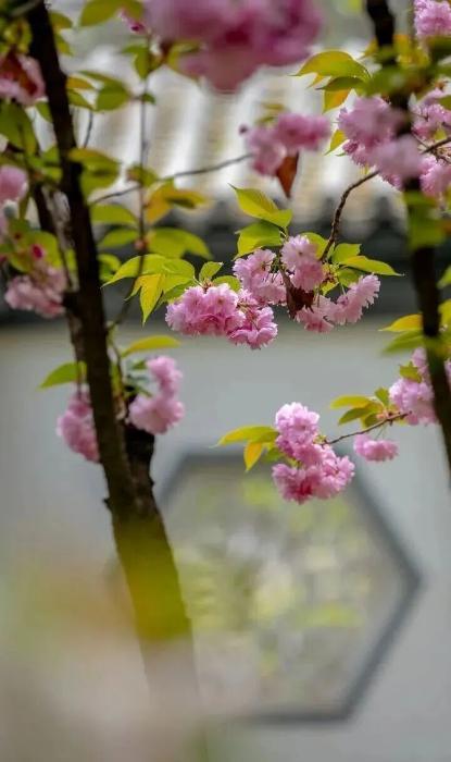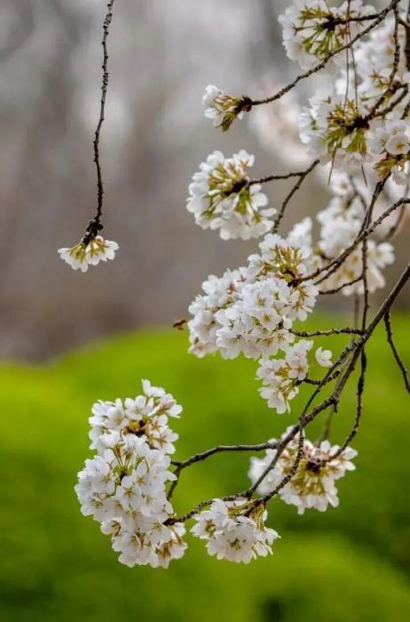 清晨薄霧繚繞時,泉水水汽氤氳,櫻花朦朧若現(xiàn),花影泉影交織,宛若寫意水墨。四月初珍稀綠櫻綻放,清冽脫俗,在粉白花海中獨樹一幟,與翠竹古碑相映,是春日不可錯過的小眾清幽景致。