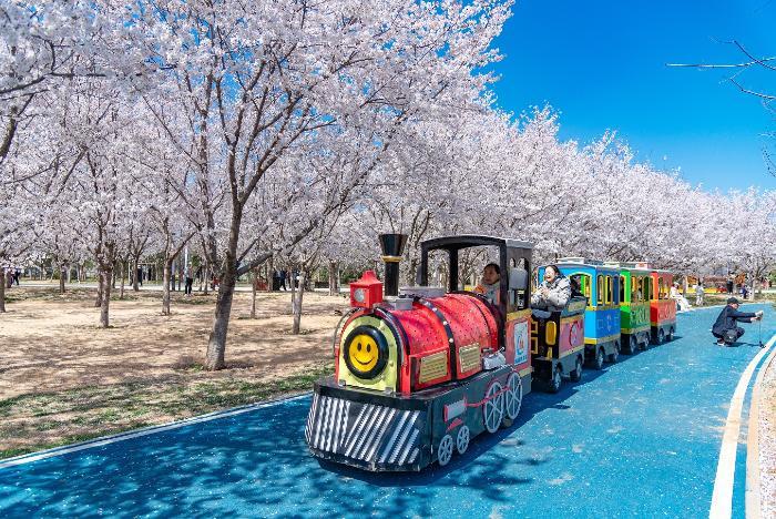 搭乘復古小火車穿行花田,春風拂面,櫻落肩頭,滿眼皆是爛漫春色。