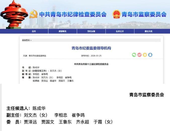 近日,青島市紀委監(jiān)委網站“領導機構”頁面顯示,陳成華任青島市紀委書記、市監(jiān)委主任候選人。