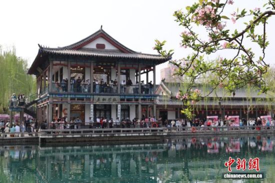 3月28日,山東濟南,五龍?zhí)度戏被ㄊ㈤_,游人如織,勾勒出一幅“泉城”春日畫卷。中新社記者 王采怡 攝