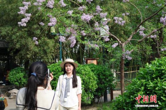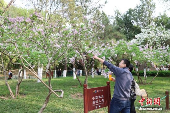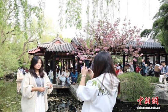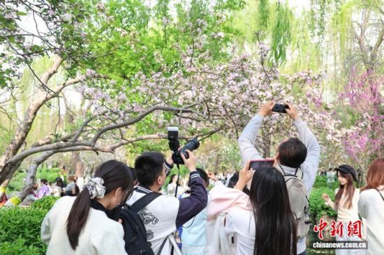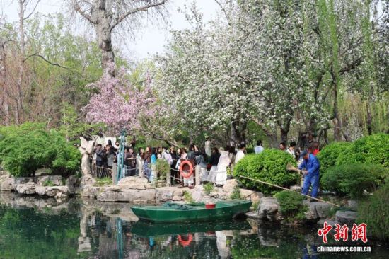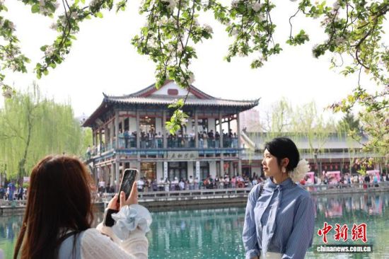 3月28日,游客在山東濟南五龍?zhí)度腺p花拍照。泉畔繁花盛開,游人如織,勾勒出一幅“泉城”春日畫卷。中新社記者 王采怡 攝