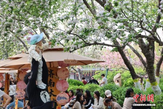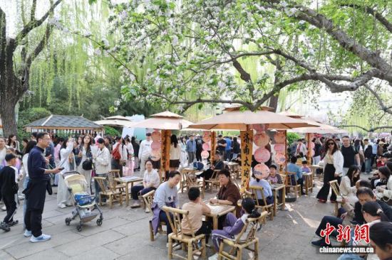 3月28日,游客在山東濟南五龍?zhí)豆珗@內(nèi)賞花喝茶。公園內(nèi)繁花盛開,游人如織,勾勒出一幅“泉城”春日畫卷。中新社記者 王采怡 攝