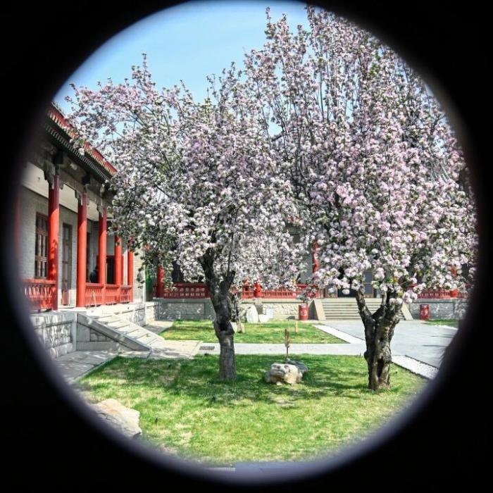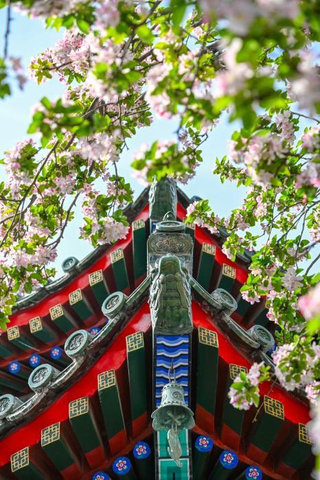 踏入山東古建筑博物館(萬字會舊址),雕梁畫棟藏著歲月底蘊,海棠便是這份厚重里最靈動的點綴。紅墻碧瓦間,粉白花枝探出院檐,風過花瓣輕落,古建的莊嚴與海棠的柔美相融,隨手一拍皆是古風佳作。