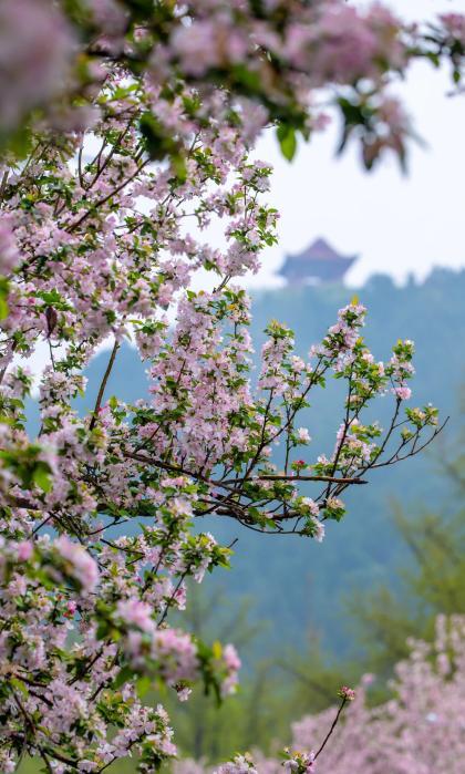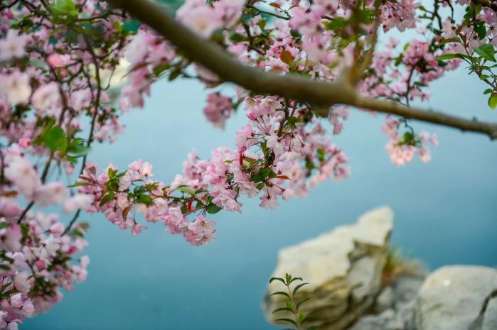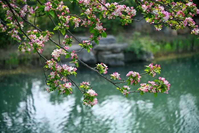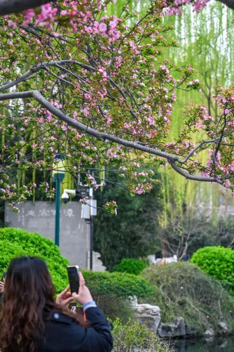 五龍?zhí)兜暮L碾m不繁密,卻株株開得熱烈。潭邊漫步,海棠倩影映在碧波中,微風拂過花枝輕顫,暗香浮動。東南角為賞棠佳處,透過花枝望向潭西名士閣,碧潭、樓閣與繁花相映,詩意盎然。