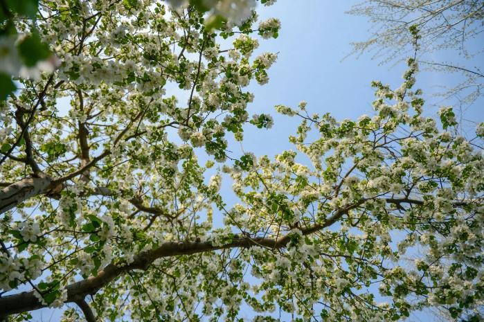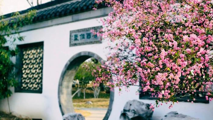 三月底,園博園海棠進入最佳觀賞期。揚州園的海棠獨植門前,如煙似霧;蘇杭園的垂絲海棠熱烈張揚;成都園的海棠溫婉嬌羞;北京園的西府海棠則別具風致,花朵較垂絲海棠更為碩大,白里透粉、粉中含白,清雅脫俗。遠遠便能嗅到一縷淡香,不濃不烈,恰好勾人駐足尋覓,四園景致各異,盡展海棠春韻。