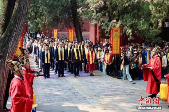 杏壇前,春花繁茂,在孔子講學(xué)故地,兩岸參祭嘉賓齊誦儒家經(jīng)典。