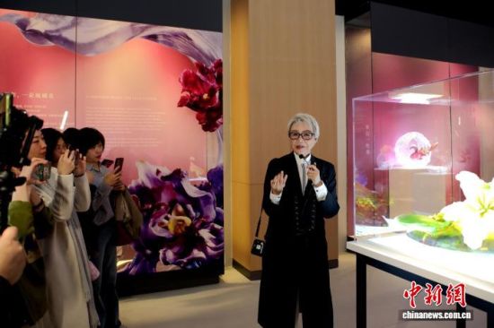 4月3日,“中國當(dāng)代琉璃藝術(shù)語言的形成——楊惠姍、張毅聯(lián)展”在中國“琉璃之鄉(xiāng)”山東淄博陶瓷琉璃博物館開幕。圖為楊惠姍在展覽現(xiàn)場介紹“一朵中國琉璃花”單元的作品。李欣 攝