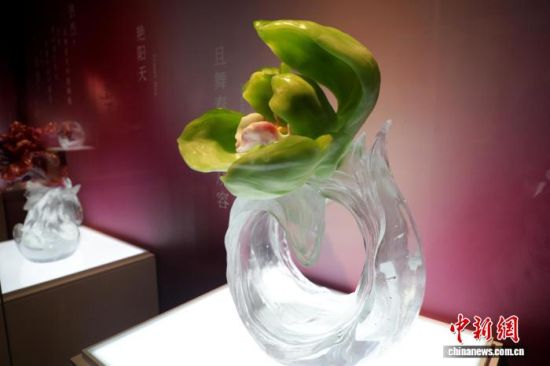 4月3日,“中國當(dāng)代琉璃藝術(shù)語言的形成——楊惠姍、張毅聯(lián)展”在山東淄博陶瓷琉璃博物館開幕。圖為現(xiàn)場展出楊惠姍的琉璃作品。李欣 攝