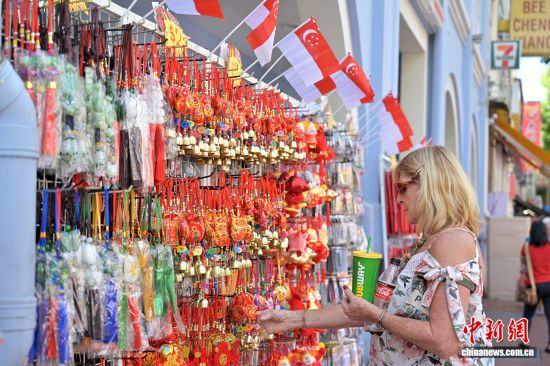 當(dāng)?shù)貢r(shí)間2020年1月5日,游客挑選新春裝飾。隨著春節(jié)臨近,新加坡牛車水變得年味十足。中新社記者 俞靖 攝