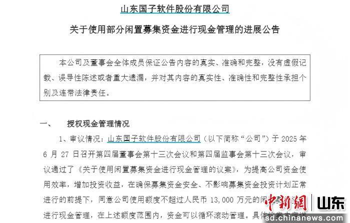據(jù)悉,國子軟件于2025年6月27日已審議通過《關(guān)于使用閑置募集資金進行現(xiàn)金管理的議案》,為提高資金使用效率,增加投資收益,在確保募集資金安全、不影響募集資金投資計劃正常進行的前提下,使用額度不超過1.3億元的閑置募集資金進行現(xiàn)金管理,額度內(nèi)資金可循環(huán)滾動管理。國子軟件表示,本次購買產(chǎn)品市場風(fēng)險較小,能夠滿足安全性高、流動性好、保證本金安全的要求,且本次交易不構(gòu)成關(guān)聯(lián)交易。