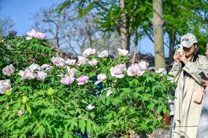 百花公園牡丹順地勢自然鋪展,少了幾分規(guī)整,多了幾分天然野趣,粉白凝脂、紫霞暈染,清潤華貴,花香怡人。